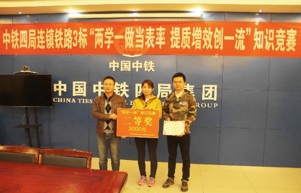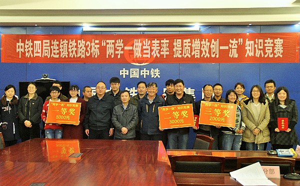 11月8日,在连镇铁路项目经理部党工委举办的“‘两学一做’当表率、提质增效创一流”主题知识竞赛活动中,连镇铁路一分部与二、三、七分部、梁场、经理部代表队同堂竞技,经过四轮比拼,一分部荣获第二名,并获颁奖状和奖金3000元。