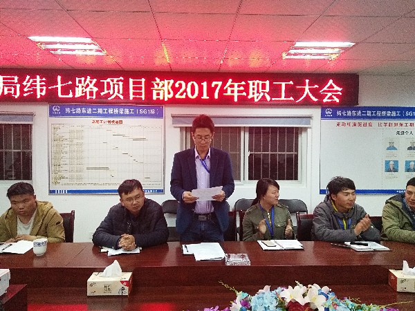 3月3日,纬七路项目部2017年职工大会成功召开,会议共同学习了公司2017年“两会”精神,对过去一年的工作进行了回顾并部署了新的一年工作目标。会议由项目书记朱小农主持,公司副总经理、分管领导梁建军及民主评议督导组参加会议。