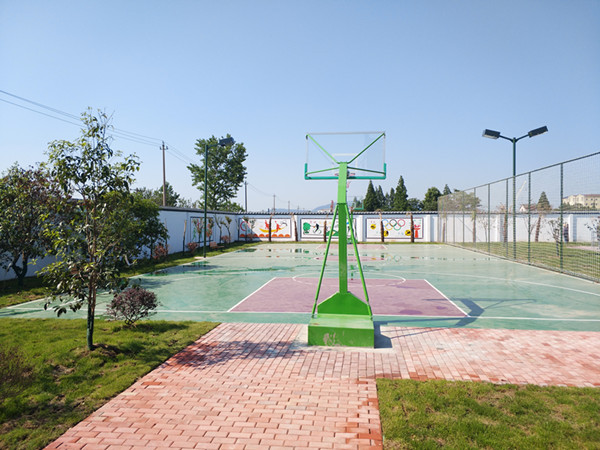“活力篮球场”位于项目部后花园内,球场三面临墙,一面围网。整个篮球场地为一长28米,宽15米的标准长方形坚实平面,地表的红、绿防滑漆不断冲击着视觉神经,四周铺绿茵茵的草坪和青翠欲滴的树木,一片勃勃生机的景象。为了便于夜间使用,球场的两侧还装有大型LED照明灯。球场的旁边设置了健身器材,方便运动或比赛前做相应热身。